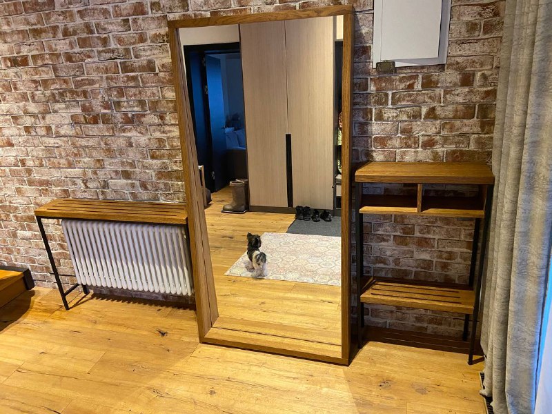 И вот такие иногда интересные конструкции у нас заказывают из цельноламельного массива дуба, с тройным покрытием маслом и тонировкой 8532-Орех. Полки, с металлическими ножками и большая, массивная рама для зеркала.