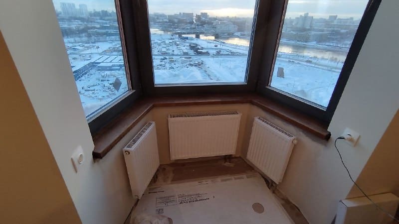 На одно эркерное окно попросили сделать и смонтировать обычные деревянные подоконники, а второй эркер закрыть полностью рабочим столом из того же материала.