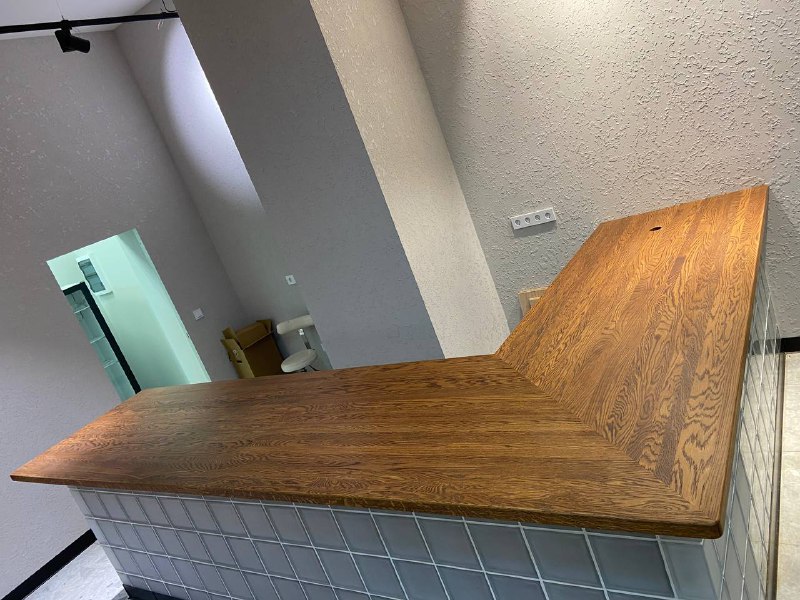 В данном случае столешница из массива цельноламельного дуба, с тройным покрытием маслом и тонировкой 8543-Мербау, фаской Ф-8.